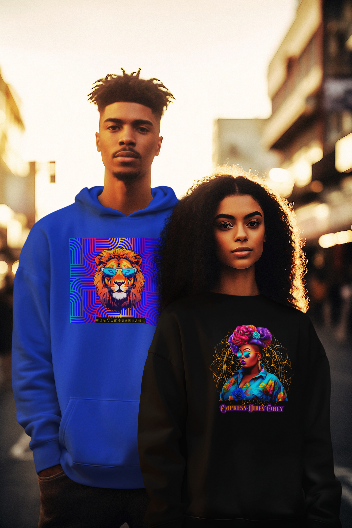 PICTURED: Left, UNISEX Authentic Champion® Hoodie, Color Royal Blue from our Hustle & Conquer Collection; Right, UNISEX Authentic Champion® Sweathshirt, Color Black in our Empress Vibes Only design from the Lady Boss Collection.