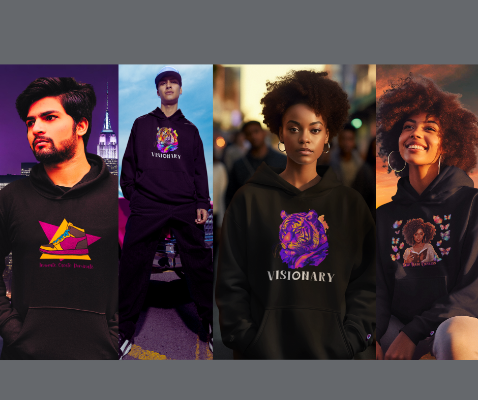 Our signature Champion® Hoodie looks pictured above from left to right: Innovate.Create.Dominate., Visionary, and Self-Made Empress. Shop these looks, then ROCK these looks. Express your essence and proudly wear your mission on your sleeve!