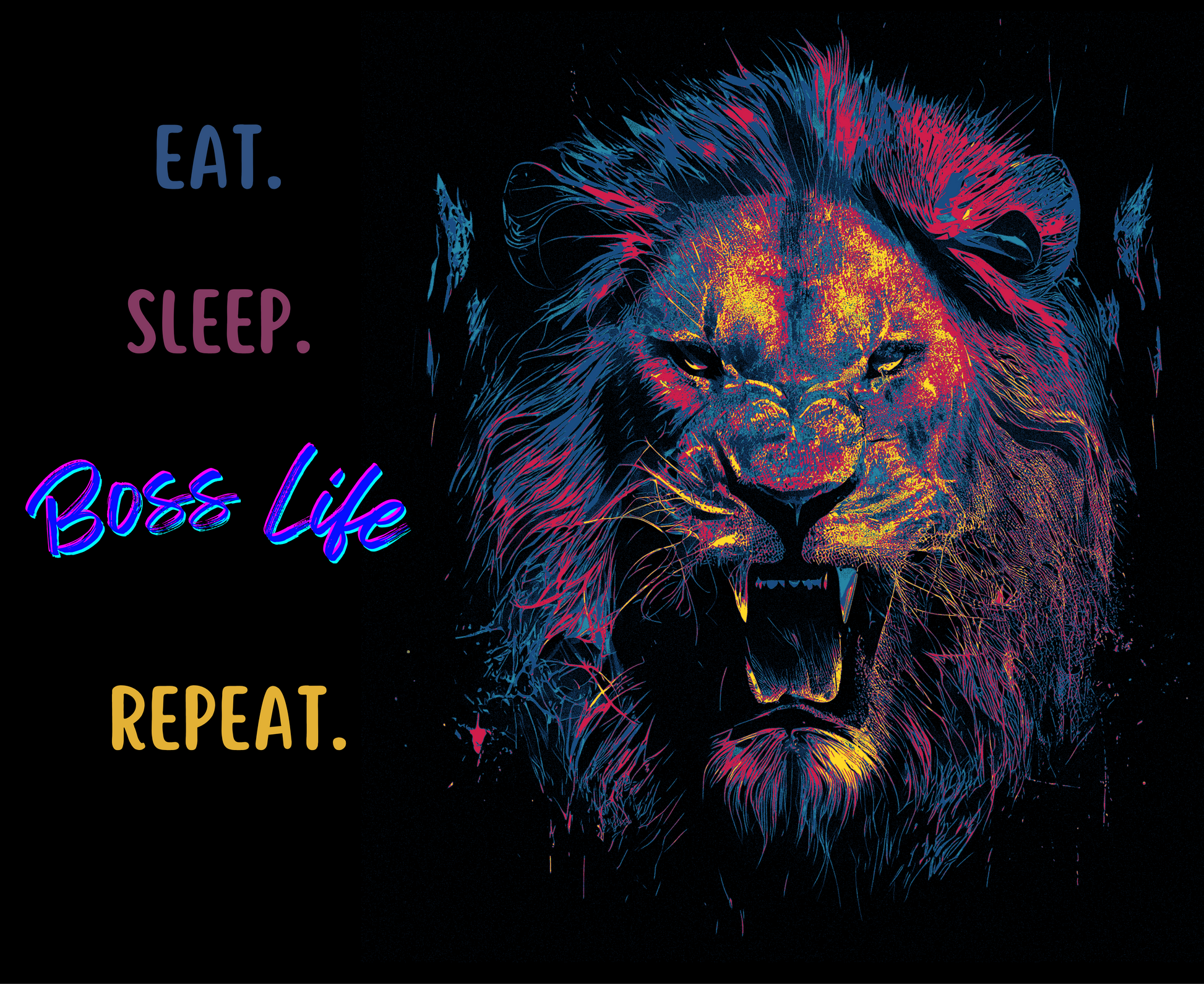 Indulge in the mantra of champions with our 'Eat, Sleep, Repeat' collection – where style meets empowerment in an explosion of urban sophistication. Picture this: an abstract spray-paint aesthetic lion head, the urban artistry incarnate, accompanied by a powerful call to action. 'Eat, Sleep, Boss Life, Repeat' – a reminder of your relentless pursuit of success and empowerment.