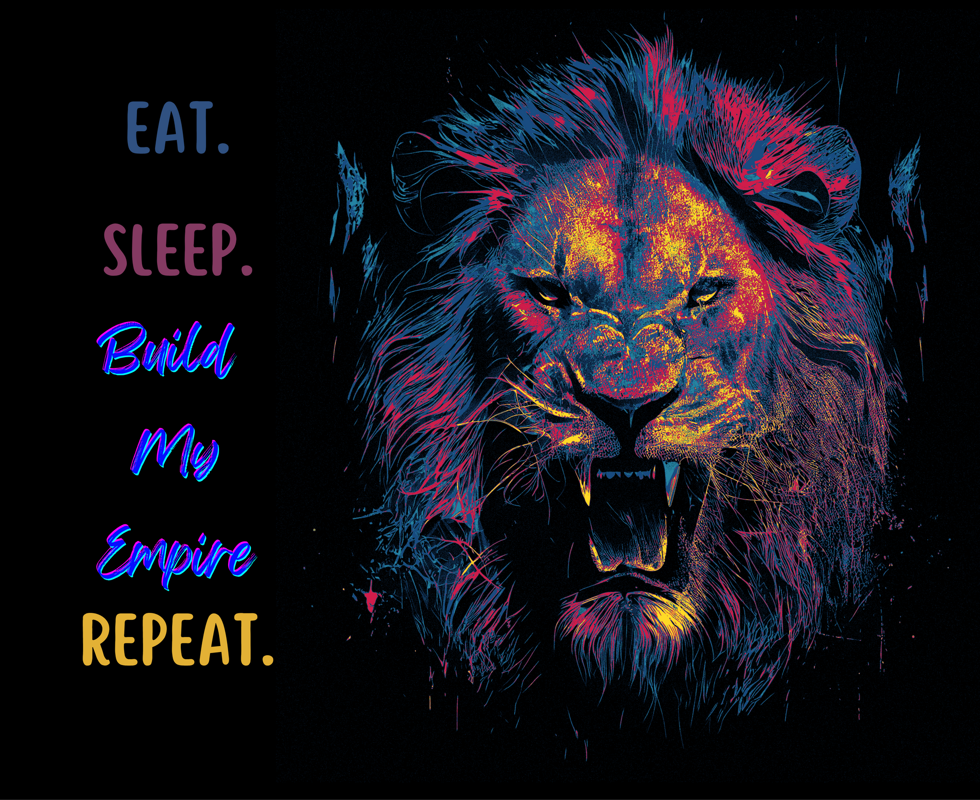Indulge in the mantra of champions with our 'Eat, Sleep, Repeat' collection – where style meets empowerment in an explosion of urban sophistication. Picture this: an abstract spray-paint aesthetic lion head, the urban artistry incarnate, accompanied by a powerful call to action. 'Eat, Sleep, Boss Life, Repeat' – a reminder of your relentless pursuit of success and empowerment.