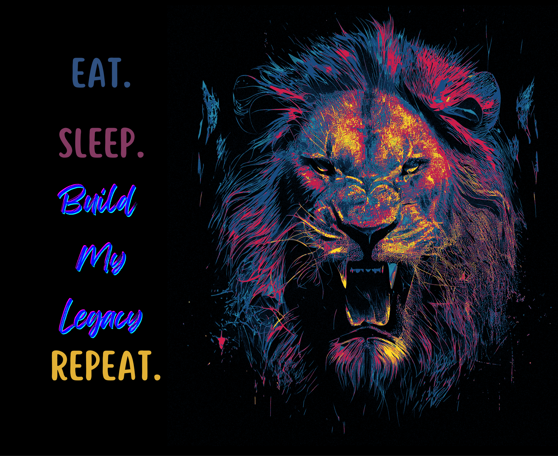 Indulge in the mantra of champions with our 'Eat, Sleep, Repeat' collection – where style meets empowerment in an explosion of urban sophistication. Picture this: an abstract spray-paint aesthetic lion head, the urban artistry incarnate, accompanied by a powerful call to action. 'Eat, Sleep, Boss Life, Repeat' – a reminder of your relentless pursuit of success and empowerment.